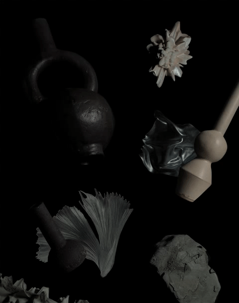 The collection is presented alongside two 3D illustrations created in collaboration with Renée Forest that feature ceramics from the collection merged with digitally rendered environments, resulting in hypnotic composite images that blur the lines between the physical and digital worlds.